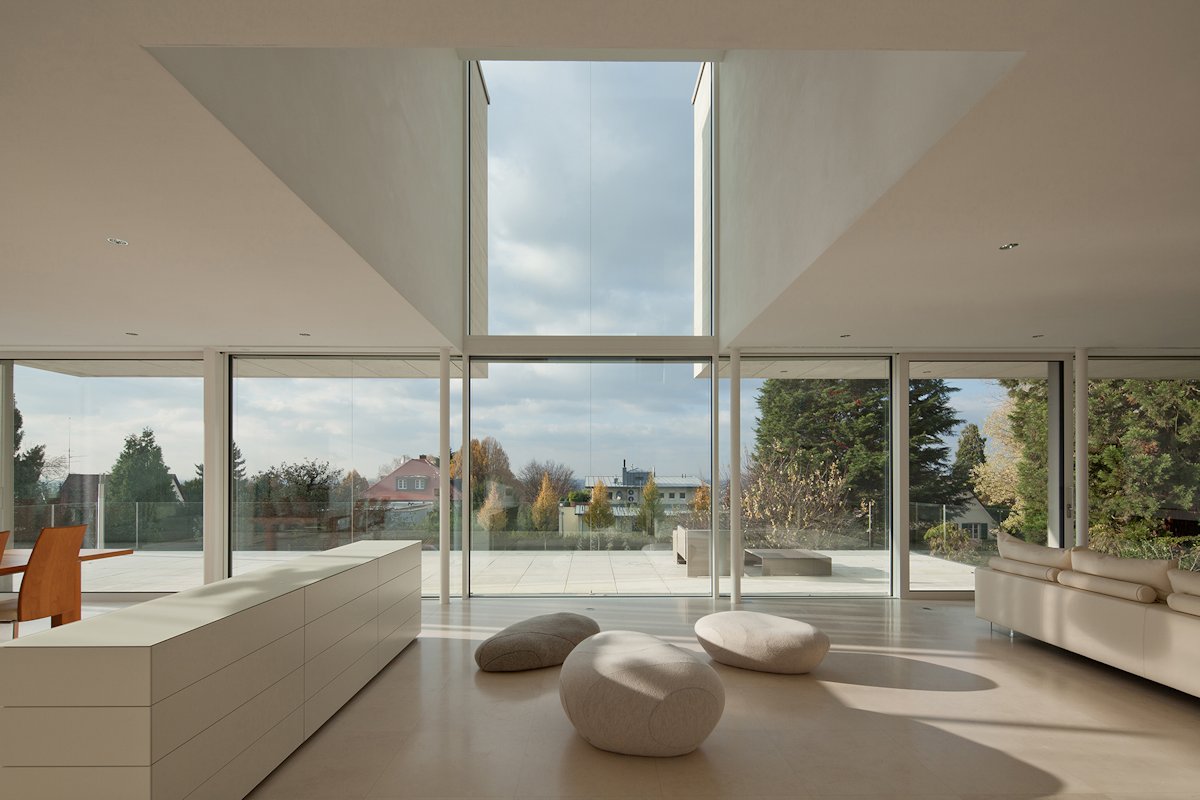 The division of the building’s volume is mirrored by its architectural design. The ground floor, which is faced entirely in glass and aluminium, contrasts with the upper level, which is clad in light-coloured natural stone. The façade that faces the street is mostly closed in order to fulfil the client’s wish for protection against uninvited onlookers. On the side facing the garden, however, the design is open and allows indoor and outdoor areas to merge together.